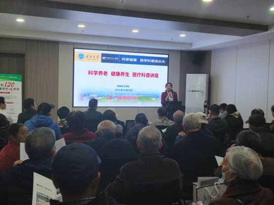 11月22日上午,提高离退职工居家科学养老意识,满足老同志健康需求,离退休工作处邀请学校附属荆州医院—荆州市中心医院的10位专家和医护人员到校,为离退休职工做了4场医疗科普讲座、急救实操演示和健康义诊。100余名离退休职工和在职员工参加了现场活动,线上同步直播,医校牵手守护老人健康,护航晚年幸福。