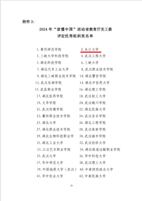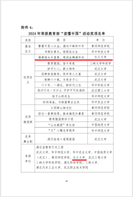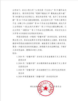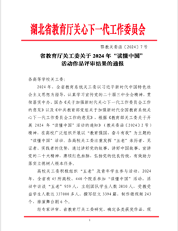 近日,教育部关工委和湖北省教育厅关工委相继公布2024年“读懂中国”活动入选作品名单,我校关工委推荐的1篇征文入选教育部关工委2024年“读懂中国”优秀征文。在湖北省教育厅关工委2024年“读懂中国”活动入选作品名单中,有3篇征文入选最佳征文,1篇征文入选优秀征文,1个微视频作品荣获最佳微视频,2个微视频作品荣获优秀微视频。学校关工委因组织工作得力、成绩突出,获得教育部关工委表扬,并荣获省教育厅关工委“优秀组织奖”称号。