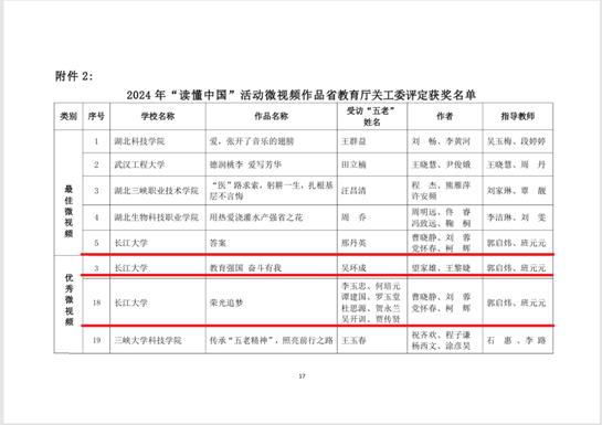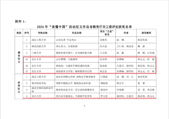 经学校关工委“读懂中国”活动作品评审组评审,最终向湖北省教育厅关工委推荐征文5篇、微视频3个。其中,入选教育部优秀征文的《情耕绿水丰盈景,慈润金穗满华田》,讲述了农学院雷慰慈教授科研报国的故事;入选省教育厅最佳征文的《心灯熠熠,文脉赓续》,讲述了文理学院沈光明教授传承和弘扬中华文学的故事;入选省教育厅最佳征文的《拐角处,与盛世不期而遇的美丽》,讲述了地科学院徐论勋教授石油人的奋斗精神;入选省教育厅最佳征文的《深钻固井力学坚,精研数理引后贤》,讲述了机械学院周志宏教授在机械领域发光发热的故事;入选省教育厅优秀征文的《昔日从军报国志,今朝卸甲育芳华》,讲述了思政专业副教授罗玉堂无私奉献教书育人的感人故事;入选省教育厅最佳微视频的《答案》,讲述了农学院邢丹英教授倾力服务地方经济、带动农民增收的感人事迹;入选省教育厅优秀微视频的《教育强国奋斗有我》,讲述了体育学院吴环成教授不断出资出力,倾注心血改善家乡荷花小学教学条件的故事;入选省教育厅优秀微视频的《荣光追梦》,讲述了几位老兵矢志不渝传承红色文化的故事。