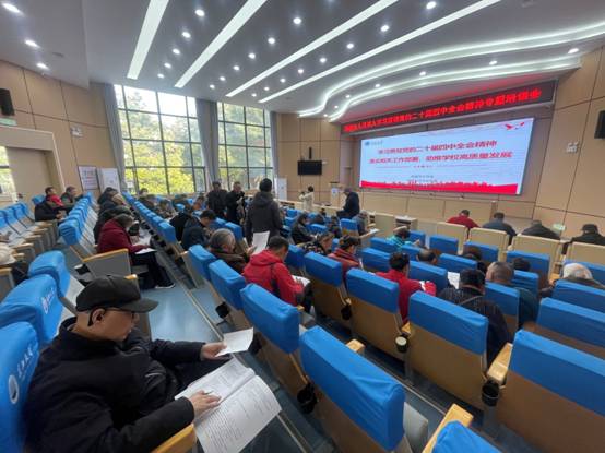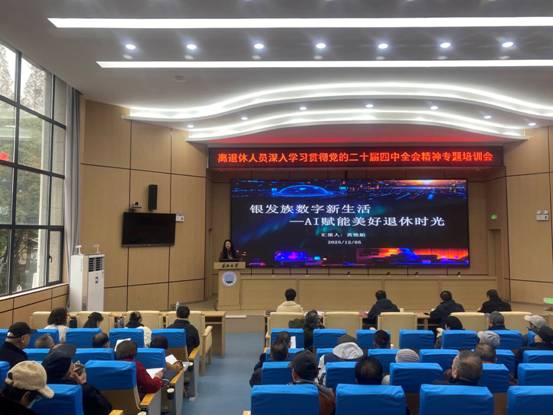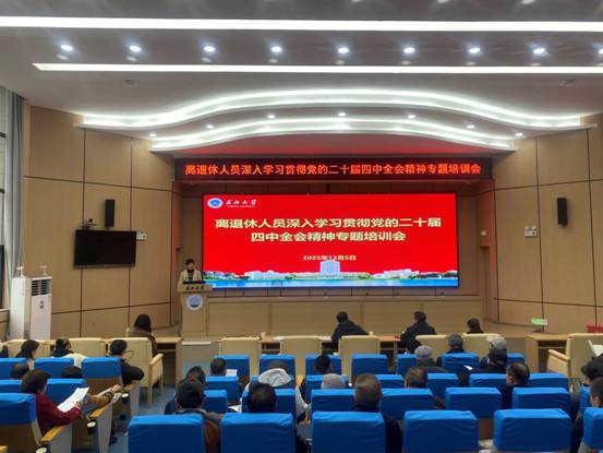 为引导离退休人员准确把握党的二十届四中全会重大意义和精神实质,推动全会精神走深走实、入脑入心,12月5日离退休工作处在东校区11教报告厅召开专题培训会,退休人员党支部委员、校老协理事、校关工委成员、老年乒乓球社、合唱团及诗书画社社团干部、老年大学教师及班长、离退处在职职工等九十余人参会。通过专题讲座、集中学习、专项答题等形式,引导离退休人员将思想和行动统一到党中央决策部署上来,为学校高质量发展凝聚“银发力量”。
