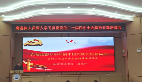 荆州市委党校赵瑞祥副教授以《在接续奋斗中开创中国式现代化新局面》为题,从“重大会议:关键时期召开的重要会议;重大判断:准确把握‘十五五’时期的历史地位;重大方针:深刻领会‘十五五’规划建议的指导思想、遵循原则及主要目标;重大任务:全面理解‘十五五’规划建议的战略举措;根本保障:坚持和加强党的全面领导凝聚团结奋斗力量”等五个方面讲授党的二十届四中全会精神。