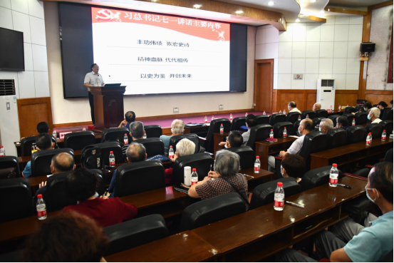 9月3日,离退休党员学习贯彻习近平总书记“七一”重要讲话精神专题辅导报告会在东校区11教报告厅举行,邀请市委宣讲团成员、学校人文社科处副处长彭开智教授做专题辅导报告。学校离退休党员代表、离退休处全体党员等近百人参加了报告会。