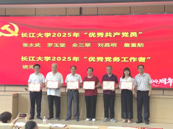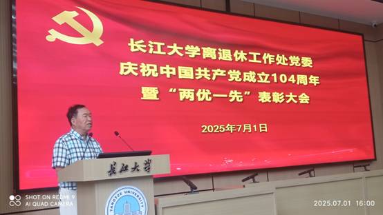 在先进典型代表发言环节,2025年湖北省示范党支部书记罗玉堂、2025年学校“优秀共产党员”代表刘昌明、“关心下一代”工作积极分子活动代表陈启武分别进行了发言。