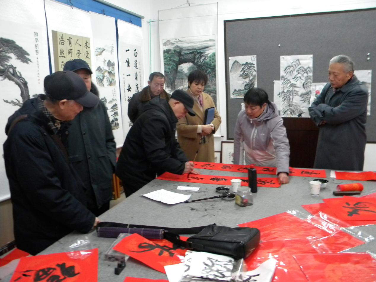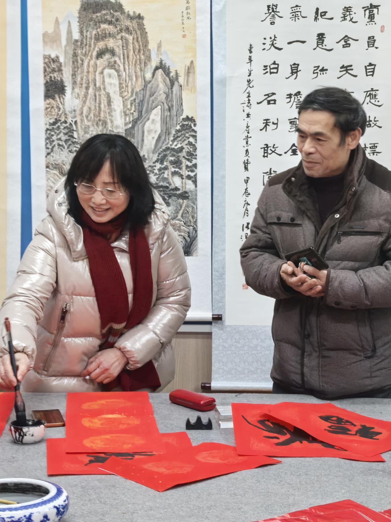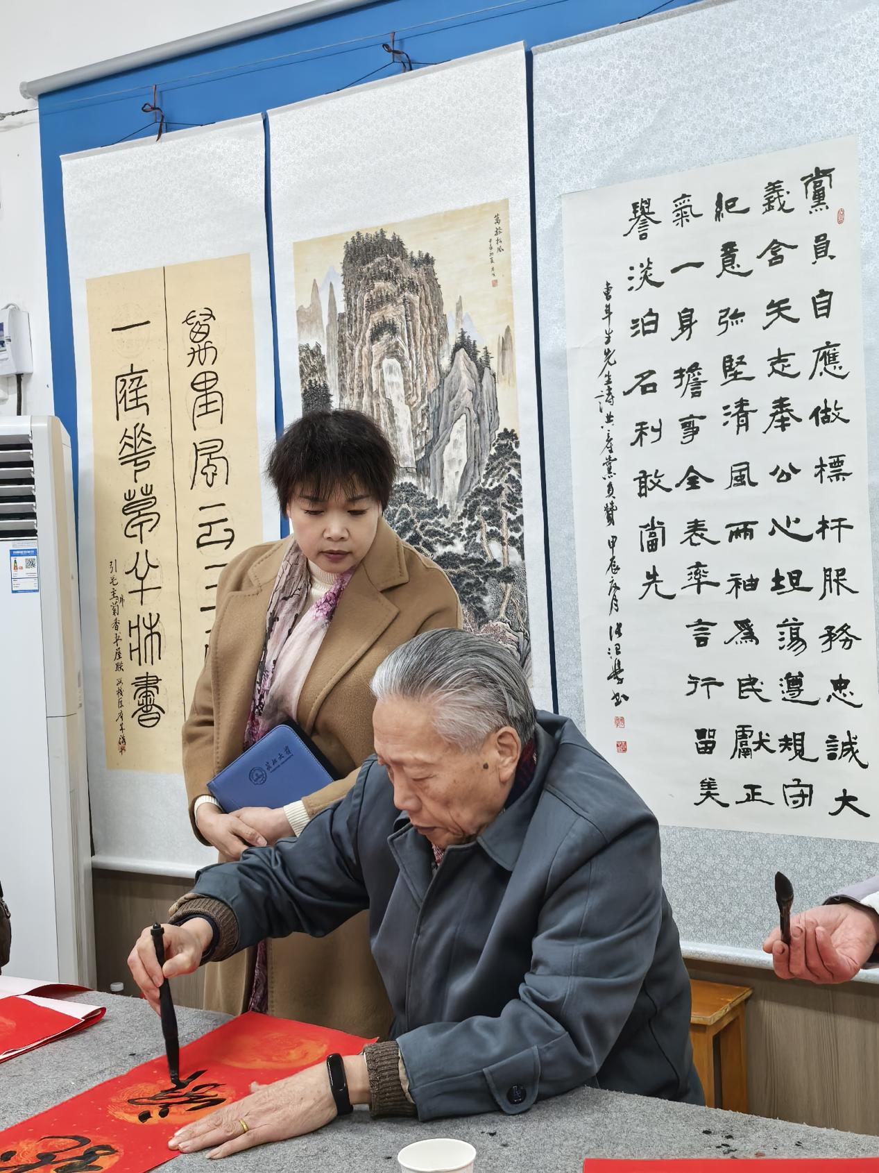 书画室内,书法家周运浓、王国清教授,绿苑诗书画社社长郑朴雄、老协委员张治学先生、会员艾兴莉女士、金升藻教授等,挥毫泼墨,笔走龙蛇。不一会儿,百余幅饱含祝福的春联铺满桌面,“福”“寿”等字样熠熠生辉。