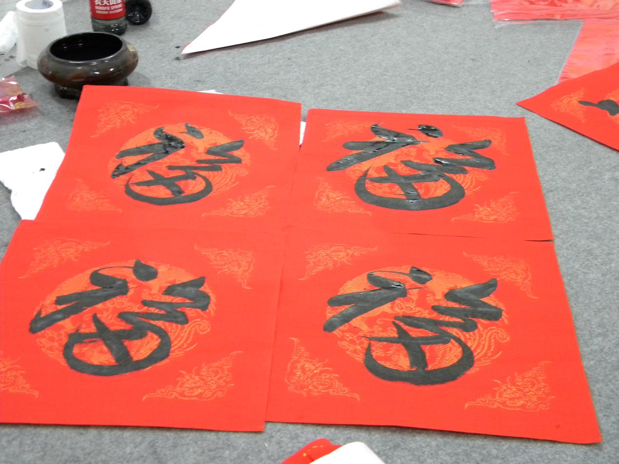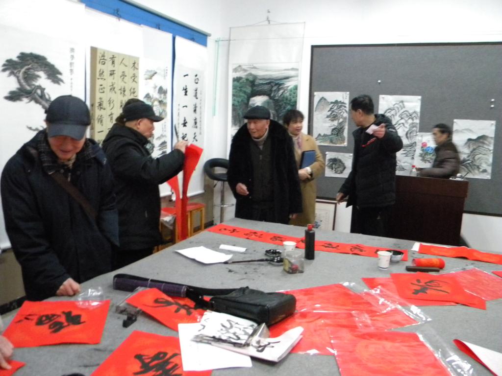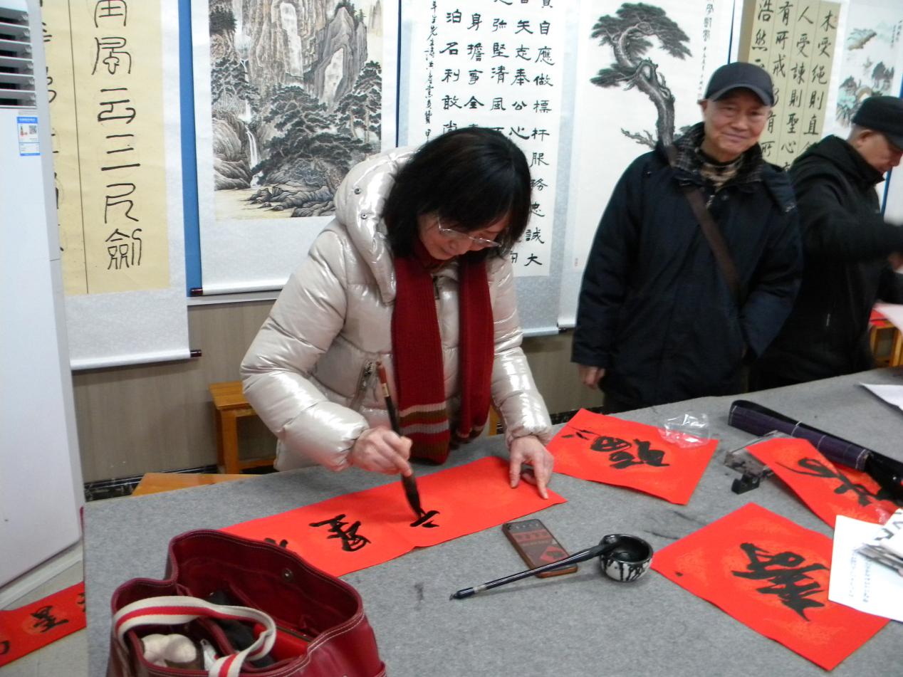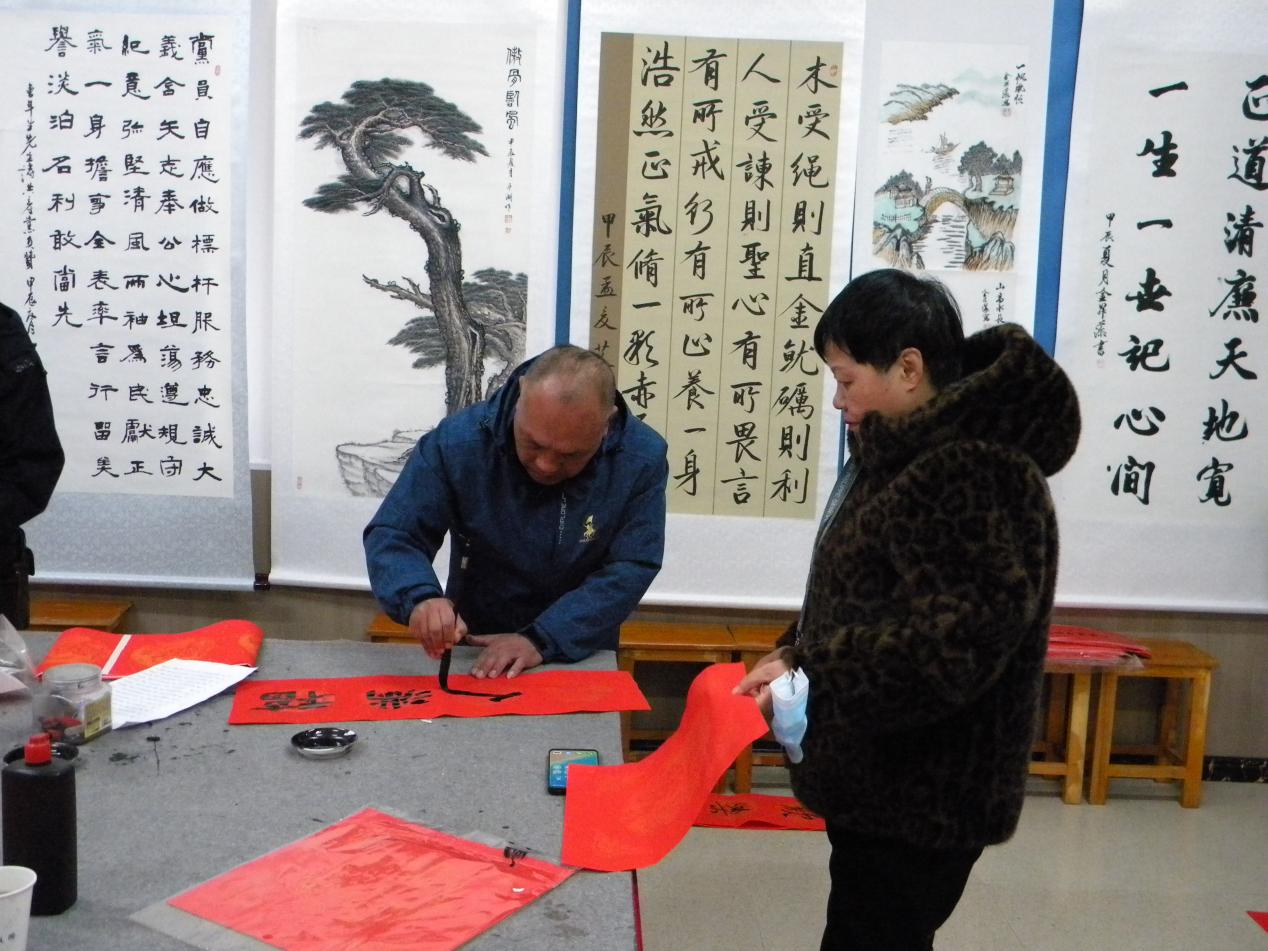 书画室内,书法家周运浓、王国清教授,绿苑诗书画社社长郑朴雄、老协委员张治学先生、会员艾兴莉女士、金升藻教授等,挥毫泼墨,笔走龙蛇。不一会儿,百余幅饱含祝福的春联铺满桌面,“福”“寿”等字样熠熠生辉。