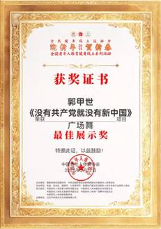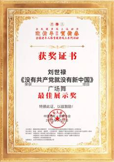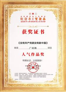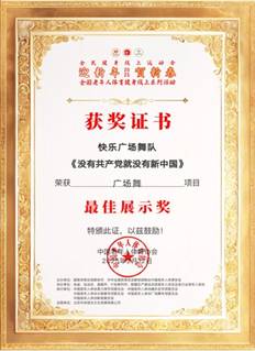 近日,我校退休职工精心表演的广场舞《没有共产党,就没有新中国》作品在645个同类视频中脱颖而出,荣获“迎新年,贺新春”2025年全国老年人体育健身线上系列活动《人气节目奖》和《最佳展示奖》。